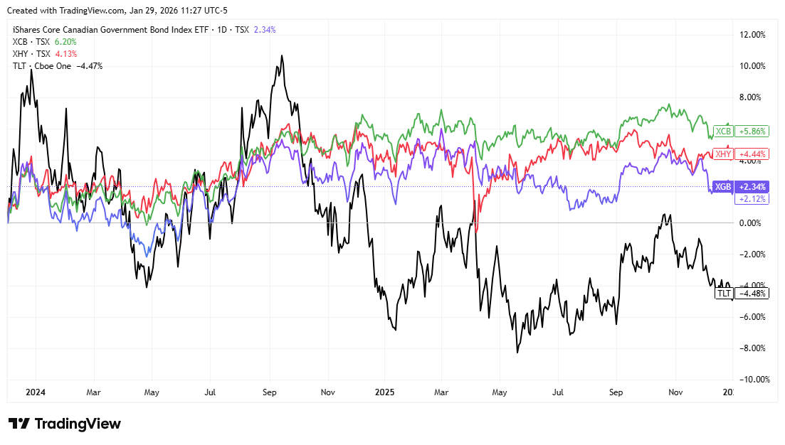 Fig. 1: Bonds-Med. term Cdn Gov’t-purple, Cdn Corp-green, High Yield-red, Long Term US-black – 2 years – TradingView