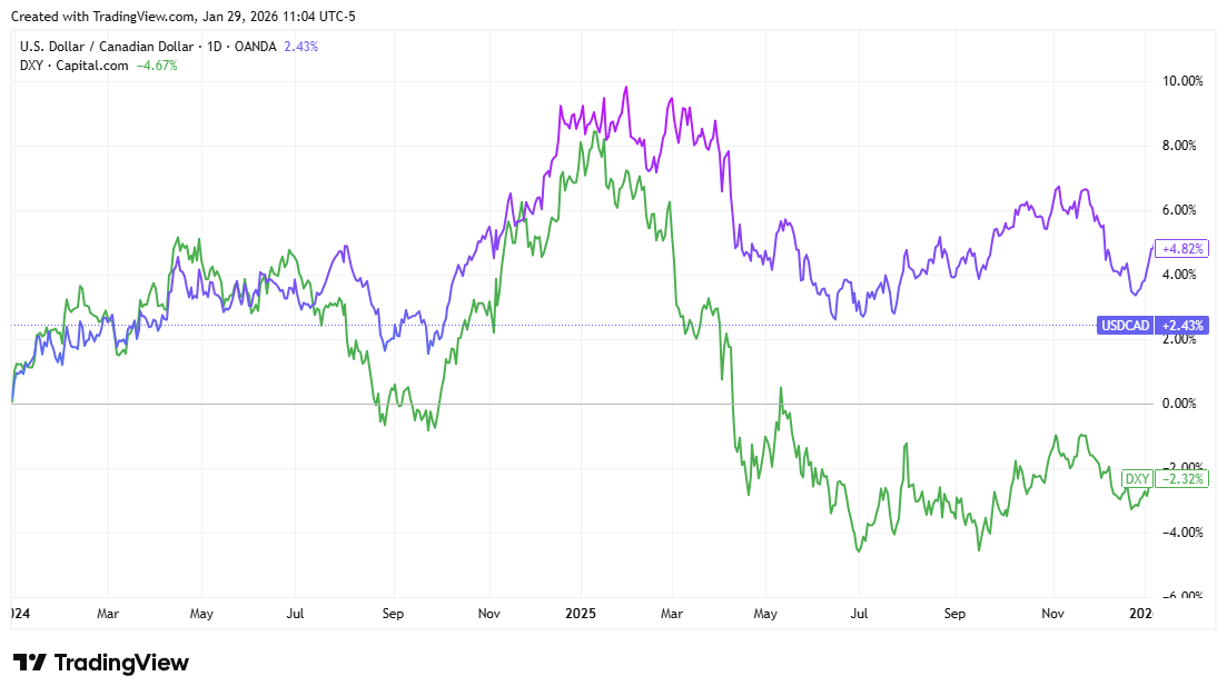 Fig. 2: US Dollar Index-green and USD vs CAD-purple – 2 years – TradingView