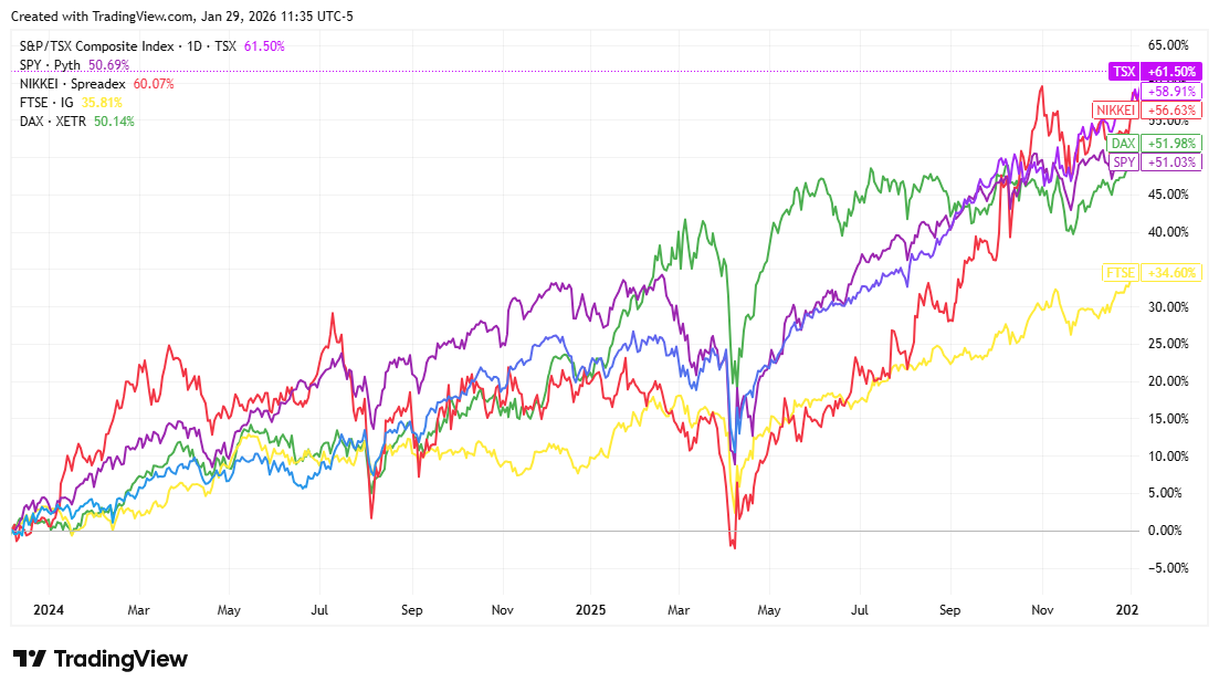 Fig. 3: Stocks: US-black, Can-purple, Jpn-red, UK-yellow, Germany-green – 2 yrs – Trading View